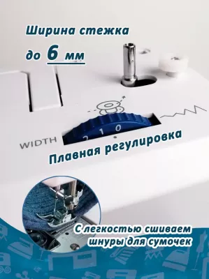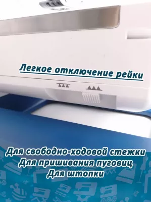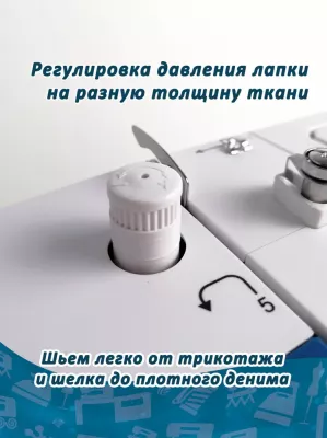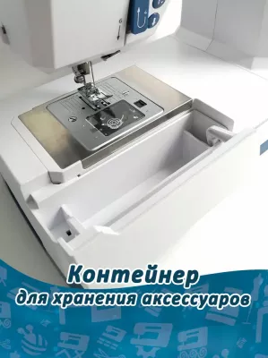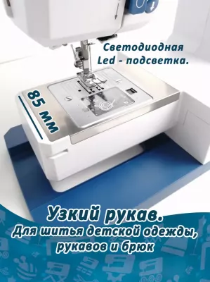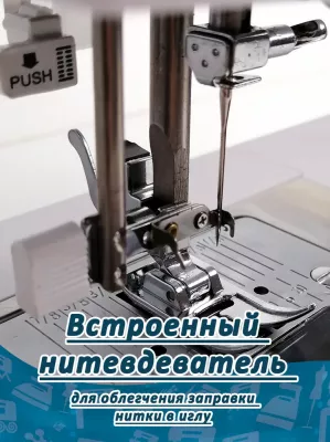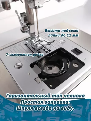 В данную машину, для комфортного шитья, мы встроили нитевдеватель, чтобы быстро заправлять верхнюю нить. Также машина снабжена системой быстрой смены прижимной лапки, автоматической настройкой ее давления на ткань и увеличенной силой прокола ткани иглой. А боковой обрезчик нити, автоматический намотчик шпульки, Led-подсветка и клавиша реверса для закрепки строчки предусмотрены для того, чтобы значительно упростить эксплуатацию машинки.